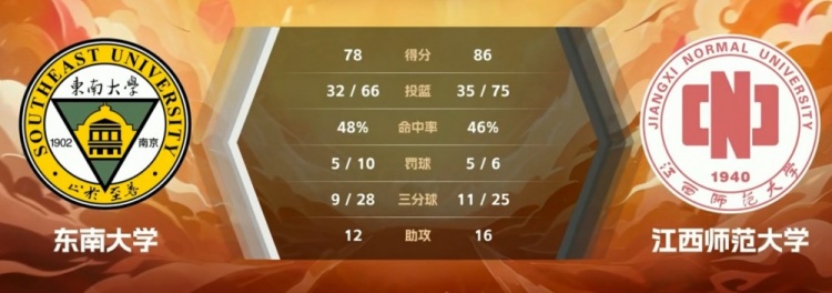 末节决战,陈子昂率先拿到两分,但之后东南大学就陷入到长达四分钟的得分荒,江西师大在此期间打出9-0的小高潮将分差拉开到两位数,胜利的天平也是彻底倒向江西师大一侧,最终江西师大86-78力克东南大学。