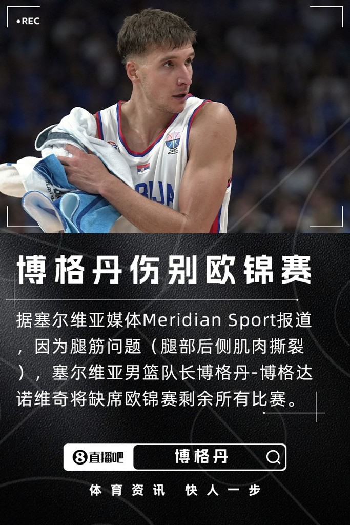 08月31日讯 据塞尔维亚媒体Meridian Sport报道,因为腿筋问题(腿部后侧肌肉撕裂),塞尔维亚男篮队长博格丹-博格达诺维奇将缺席欧锦赛剩余比赛。
