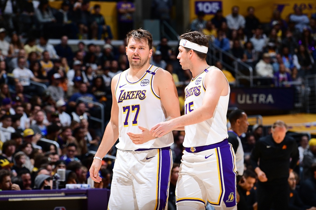 湖人首发摆东契奇+小里+古德温+电风扇+海斯,这是东契奇喜欢的配阵体系:5号位挡拆吃饼型中锋,古德温和电风扇都能提供3D属性还不占球权,2号位小里能担任持球副攻,且2、3、4号位都有射程为东契奇高位挡拆拉开空间——三个空间点拱卫东契奇与5号位挡拆体系,东契奇在达拉斯单核带队时就玩这套的体系,东契奇即是湖人的基本盘。
