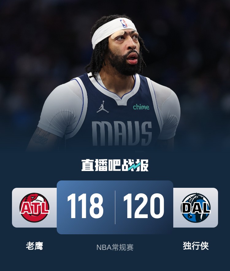 比赛开始,双方上来就展开对攻战,浓眉率先发力,里突外投单节砍下13分,但即将结束前被加福德误伤眉角流血,老鹰全民皆兵回应首节还领先2分,次节特雷-杨开始发力,单节轰下16分助队建立主动权,丁威迪串联球队,独行侠也是持续咬住比分,半场老鹰领先5分。下半场,老鹰连续三分守住优势,但浓眉统治攻防,各种中投加内线强打带队咬住比分,随后独行侠一波10-0三节反超5分,末节浓眉接连暴扣带队7-0拉开比分,但老鹰接连三分回应10-1再次咬住比分,比赛进入白热化,丹尼尔斯三分加奥孔武抛投反超3分,克莱三分追平,浓眉抛投准绝杀并锁死特雷-杨的反绝杀!最终,独行侠120-118险胜老鹰。