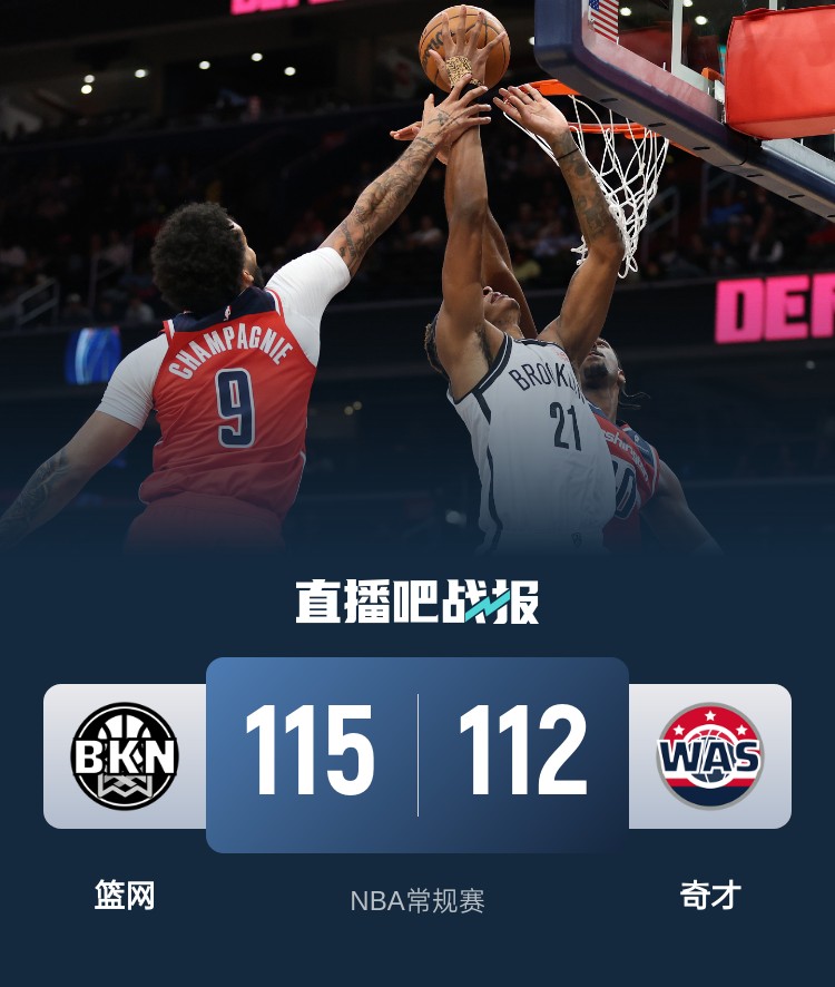 比赛上来,奇才先拿六分取得领先,篮网虽然及时追上并与对手保持拉锯,但在首节末段还是败下阵来,次节奇才继续占据场上主动权,分差也是拉开到两位数,半场结束时篮网落后8分;下半场回来,奇才的进攻突然停止,4分钟的时间里被篮网打出12-2的攻势完成反超,两队之后再次陷入拉锯战,不过到了末节奇才的进攻遇到大麻烦,篮网逐渐取得场上领先,但卡梅隆-约翰逊和克洛尼相继受伤离场,奇才此后虽然追上比分但未能实现逆转,关键时刻A-约翰逊命中反超三分,蒂米顺下造成干扰球,奇才发球再失误,威尔逊两罚全中,A-约翰逊再扔绝平三分不中,最终篮网险胜奇才止六连败。