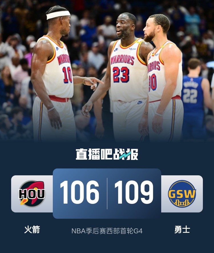 比赛开始,追梦先中2记三分,杰伦-格林连续出现失误,勇士火力全开轰出16-4的攻击波确立优势,阿门连得5分止血,火箭连中三分迅速迫近比分,次节范弗里特再中三分率队反超,狄龙对库里犯规引发小摩擦,加上追梦三人均吃到技术犯规,两队场上持续缠斗,比分咬得很紧,追梦踢到伊森被吹一级恶犯,库里连续失误,火箭利用反击拿分,半场战罢火箭57-50领先勇士。易边再战,火箭完全哑火,勇士风卷残云轰出18-1的进攻狂潮确立两位数优势,范弗里特挺身而出连中三分止住颓势,双方打得难解难分,比分咬得很紧,末节双方争夺陷入白热化,范弗里特和希尔德对飙三分,波杰姆斯基送出大帽,巴特勒反击得手,范弗里特再中三分扳平,关键时刻巴特勒三分造成犯规火箭挑战失败,巴特勒3罚全中,申京中投续命,勇士连续进攻不中,申京强攻也没,巴特勒关键篮板两罚全中。最终,勇士109-106再胜火箭,总比分3-1拿到赛点。
