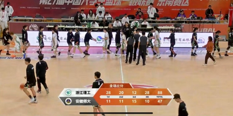 次节上来,双方展开拉锯战,安徽师大接连拼抢前场篮板,王腾连续补篮追分,但无奈自身失误较多,苏靖妍和万颖连续得分帮助球队拉开20分以上领先。汪丽雪止血,但安徽师大进攻端始终不在状态,潘维嘉接连补篮命中帮助浙江理工扩大领先,半场浙江理工48-22领先安徽师大。
