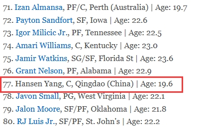 来自CBA青岛男篮的杨瀚森排名第77,呈现缓慢上升的趋势(前两次ESPN的榜单中,杨瀚森排在第80和第90)。