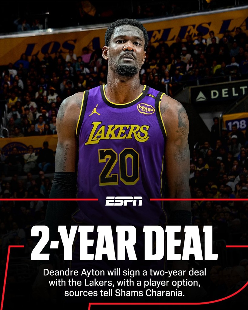 07月03日讯 据ESPN名记Shams Charania报道,数位消息人士透露,自由球员、中锋艾顿同意加盟湖人。