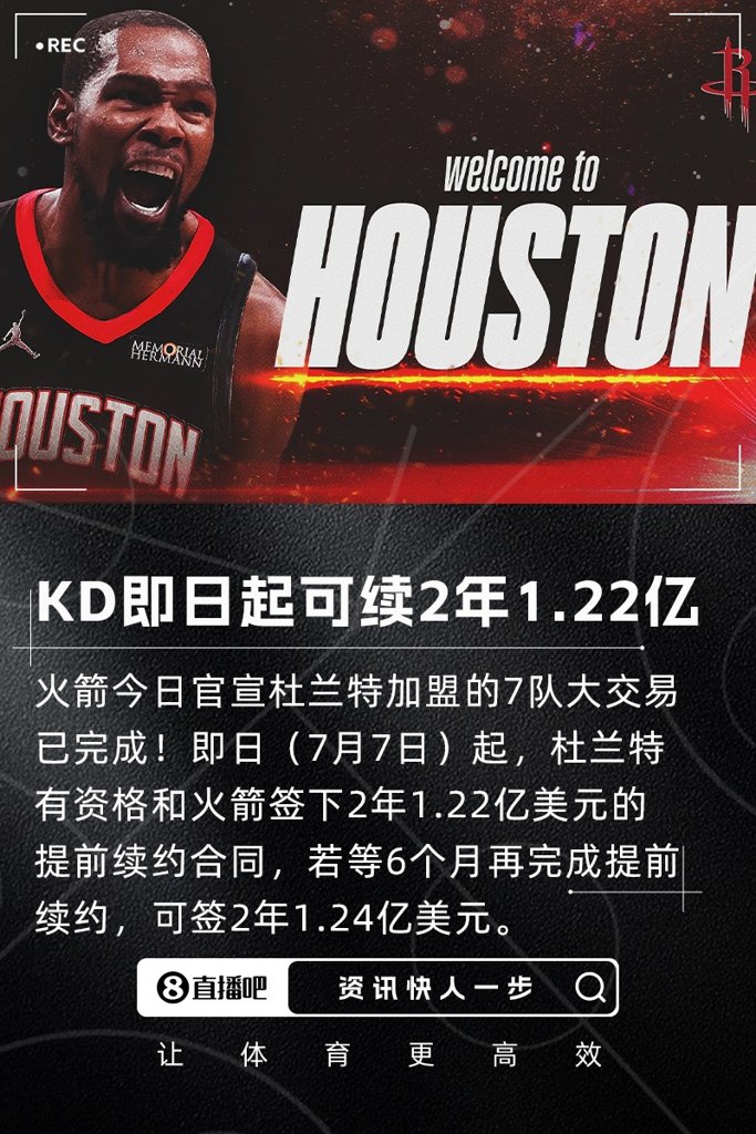 07月07日讯 今天凌晨,杜兰特、卡佩拉加盟火箭的七队大交易获得官宣。