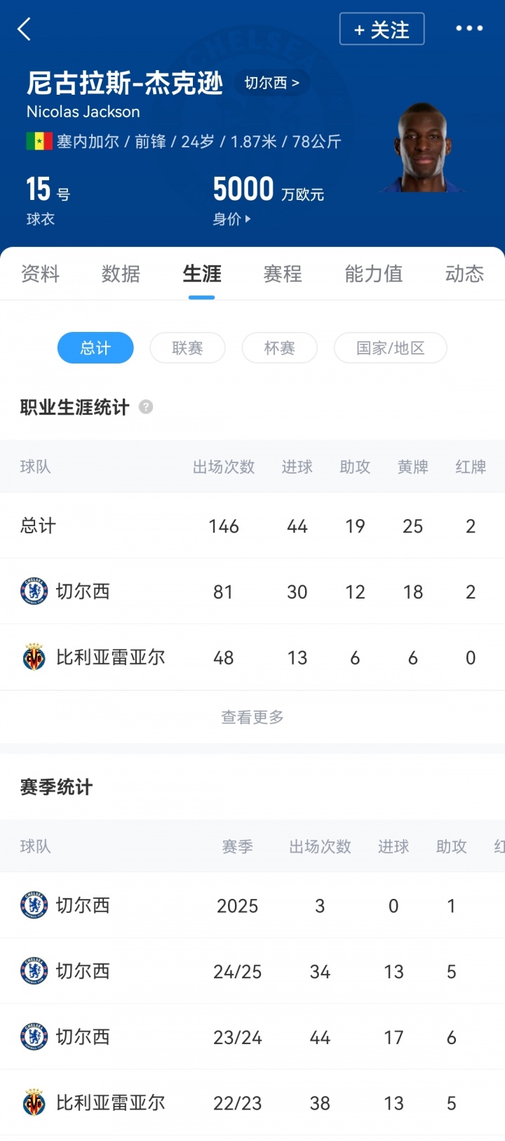 杰克逊现年24岁,加盟切尔西以来球员出场81次,贡献30球12助。目前杰克逊德转身价为5000万欧元。