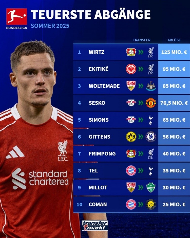 9月4日讯 德甲夏窗已经截止,《转会市场》也统计了德甲今夏的最贵卖人榜,维尔茨断崖领跑。