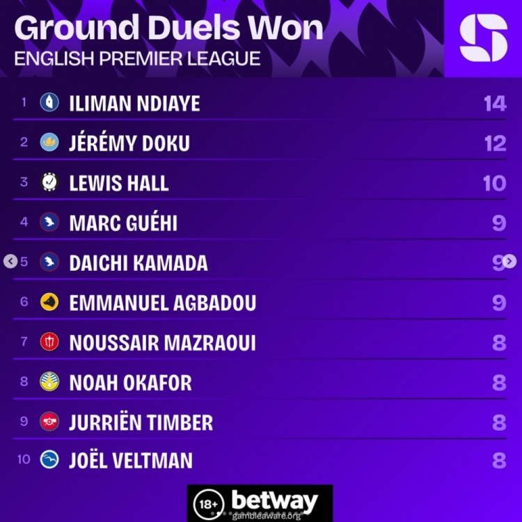 9月24日讯 英超第5轮战罢,squawkafootball列各项数据排行,埃弗顿边锋恩迪亚耶是赢得地面对抗最多的球员,共计14次。
