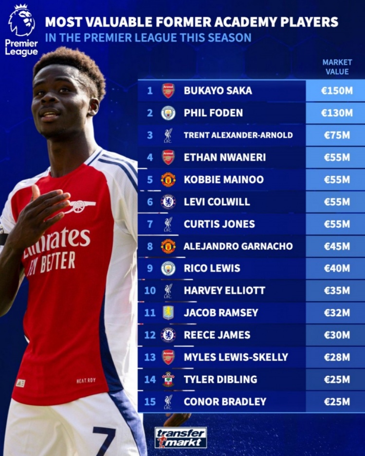 3月20日讯 德转此前更新了英超球员身价,并盘点了本赛季出自球队青训的球员中身价最高榜单,其中萨卡居首,福登次席,具体如下: