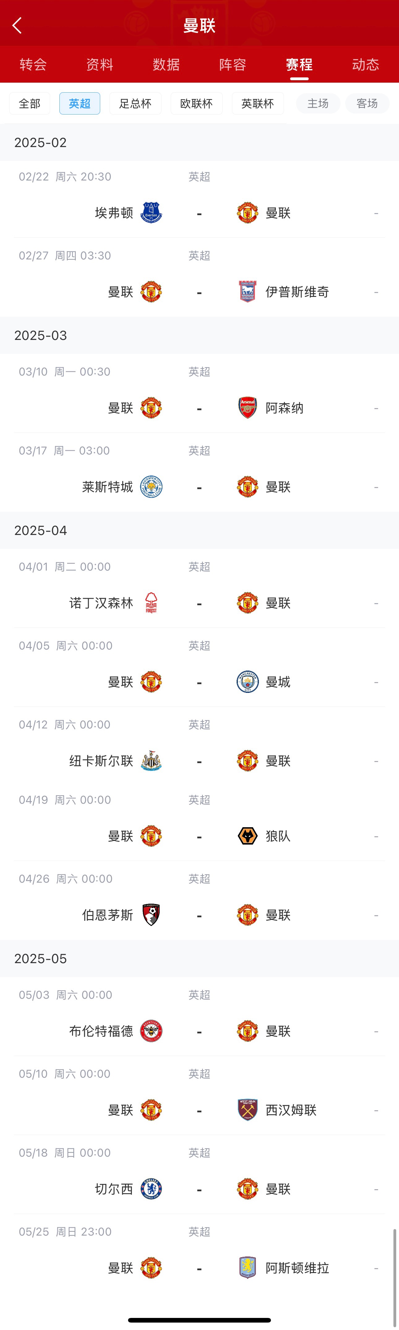 “客战埃弗顿,主场对伊普斯维奇,阿森纳,客战诺丁汉森林,曼城,客战纽卡,狼队、布伦特福德、布莱顿、切尔西、维拉、莱斯特城。”