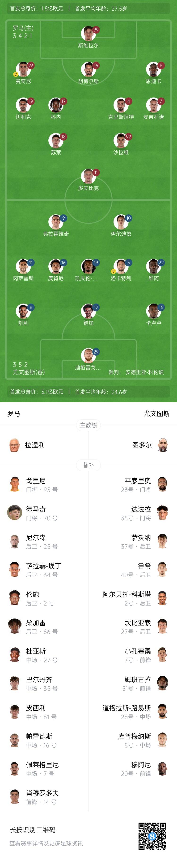 罗马首发:99-斯维拉尔、15-胡梅尔斯、23-G-曼奇尼、5-恩迪卡、19-切利克、4-克里斯坦特、17-科内、3-安吉利诺、18-苏莱、92-沙拉维、11-多夫比克
