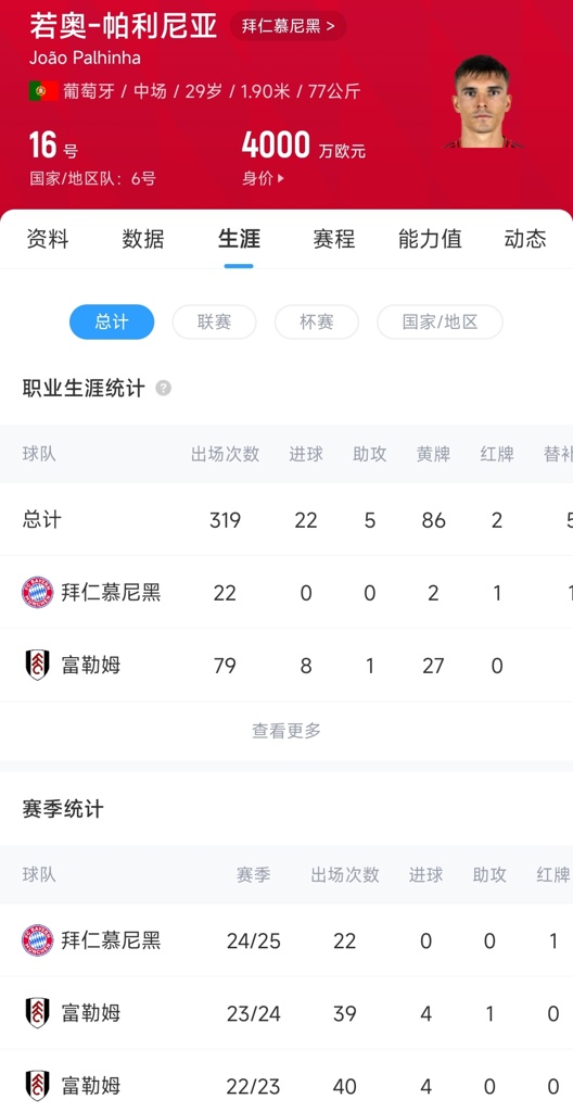2023年夏窗图赫尔在任时,拜仁就曾接近签下帕利尼亚,帕利尼亚也一度抵达慕尼黑接受体检,但最终因富勒姆未找到替代者而告吹。一年后拜仁主帅由图赫尔换成孔帕尼,帕利尼亚如愿加盟拜仁,转会费5100万欧元,但来到拜仁后,帕利尼亚并未受到孔帕尼重用。目前29岁的帕利尼亚德转身价为4000万欧元,他与拜仁的合同将在2028年6月到期。