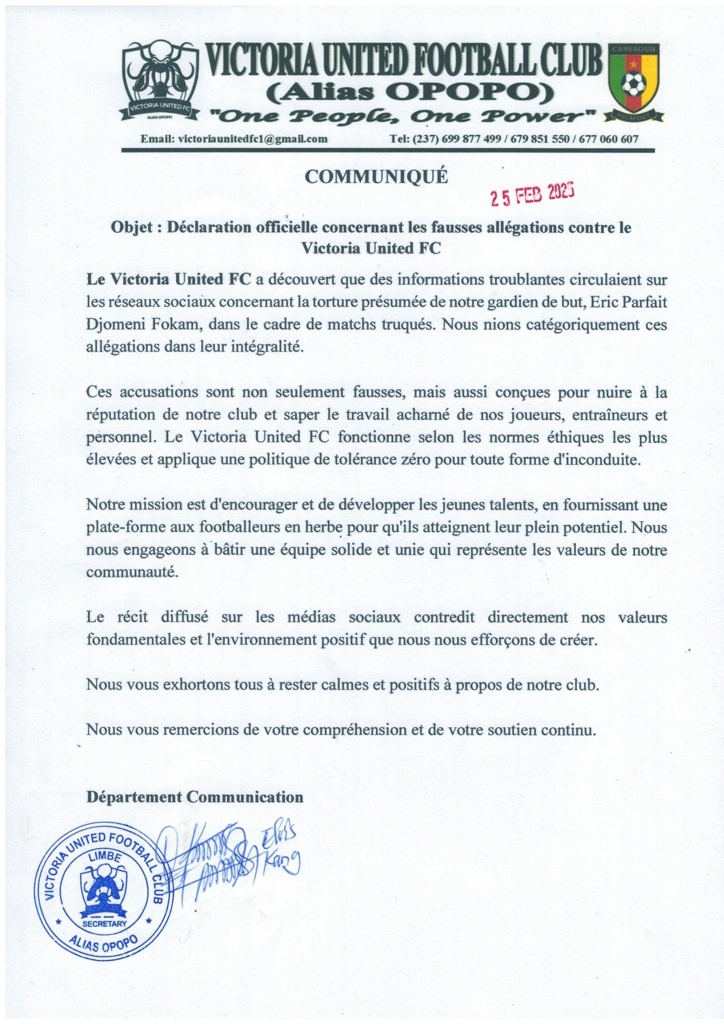 随后,俱乐部发布新闻稿否认了这起事件。目前喀麦隆足协官方暂未介入。