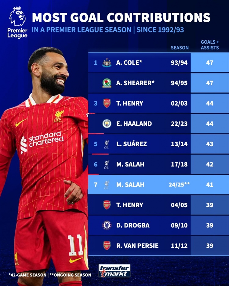 7、萨拉赫——41(2024-25赛季,赛季未结束)