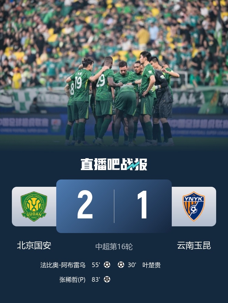 6月30日讯 北京时间19:35,中超第16轮北京国安vs云南玉昆,比赛在北京工人体育场打响!上半场,叶楚贵帮助客场作战的云南玉昆取得领先!法比奥禁区倒地获得点球,随后被VAR取消!下半场,张玉宁头球摆渡,阿布雷乌扳平比分!张玉宁随后又制造点球!张稀哲主罚命中!