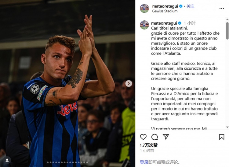 雷特吉在社交媒体上传了自己身穿亚特兰大球衣的照片,并配文写道:“亲爱的亚特兰大球迷们,衷心感谢你们在这美好的一年里给予我的所有关爱。能够身披亚特兰大这样一家伟大俱乐部的球衣,我深感荣幸。
