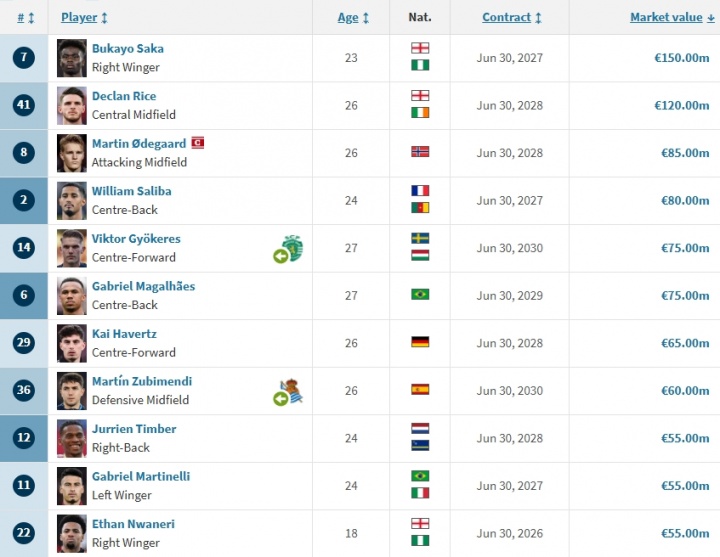 阿森纳正式签下瑞典前锋约克雷斯,队内身价排名方面,27岁的约克雷斯以7500万欧身价空降队内第五名。